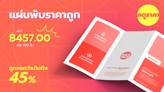 บริการรับทำแผ่นพับสำหรับธุรกิจทุกขนาด ให้คุณสั่งพิมพ์ได้แม้ยอดออร์เดอร์มีปริมาณน้อย เริ่มต้นเพียงแค่ 100 แผ่น/คำสั่งซื้อ เลือกแพ็กเกจพิมพ์แผ่นพับเพิ่มเติมได้ที่นี่เลย!