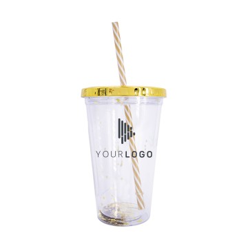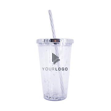 แก้วน้ำพลาสติกที่ใส่กลิตเตอร์รอบแก้ว สามารถเขย่าเล่น สนุกสนาน มาพร้อมหลอดและแก้วเป็นแบบครอบสองชั้น มีให้เลื