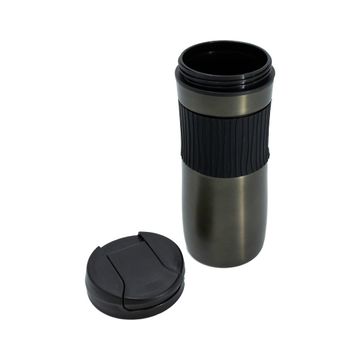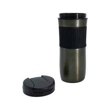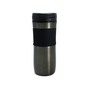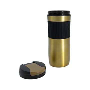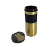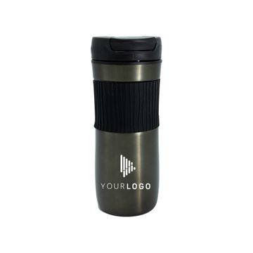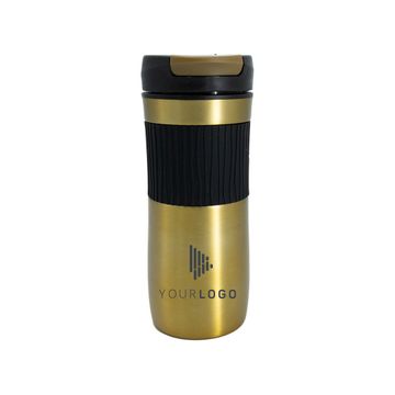 This 16oz mug has a plastic wall with silicone thermal sleeve. Available in 2 colors; gray and gold. All promotional drinkware items are delivered individually packaged in white cardboard boxes.