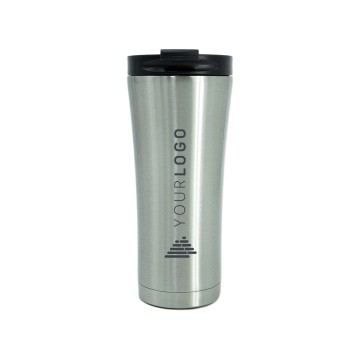 500ml Stainless Steel Coffee Mug, perfect for the office or on the go! Easy latching mouthpiece, vacuum sealing twist-on top and rubber bottom help make sure your drink stays in the cup and not on the floor! Stainless steel interior can hold any temperature liquid (hot or cold). All promotional drinkware items are delivered individually packaged in white cardboard boxes.